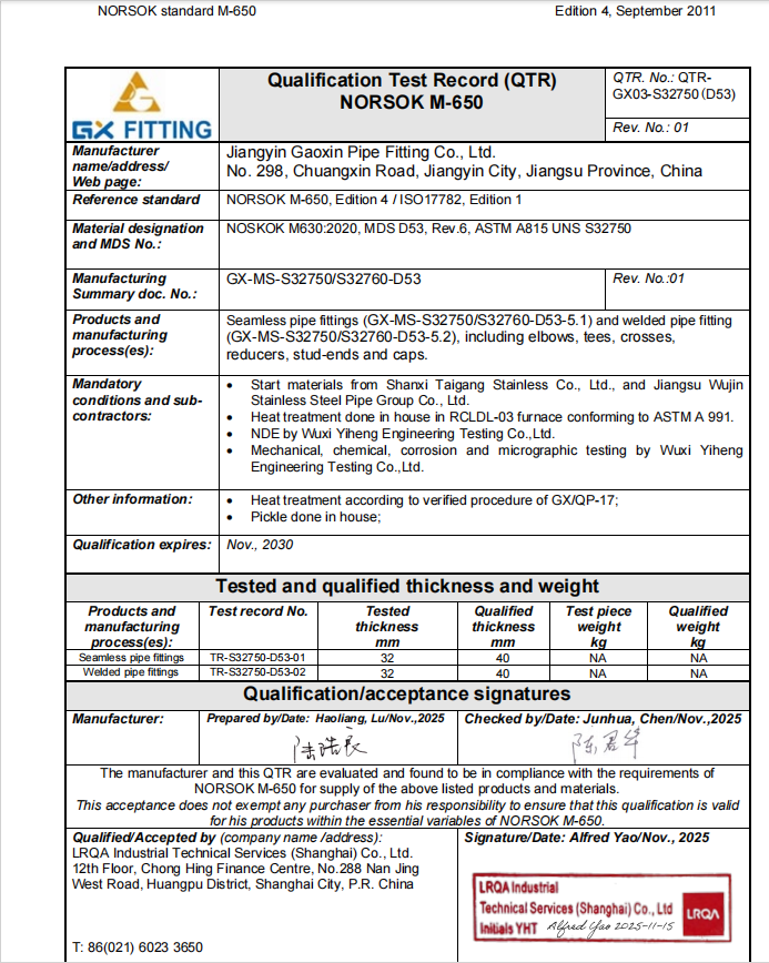 Suntem încântați să vă spunem că compania noastră a obținut cu succes certificarea NORSOK M650 pentru cinci grade importante de aliaje rezistente la coroziune: S32205, S31803, S32750, S32760 și S31254.